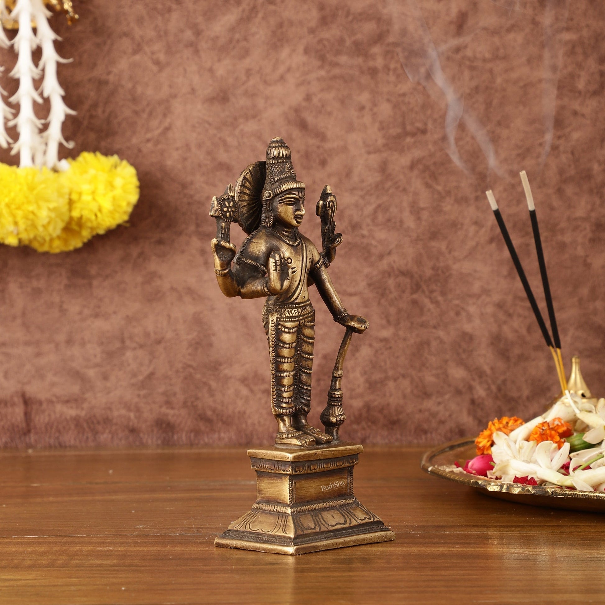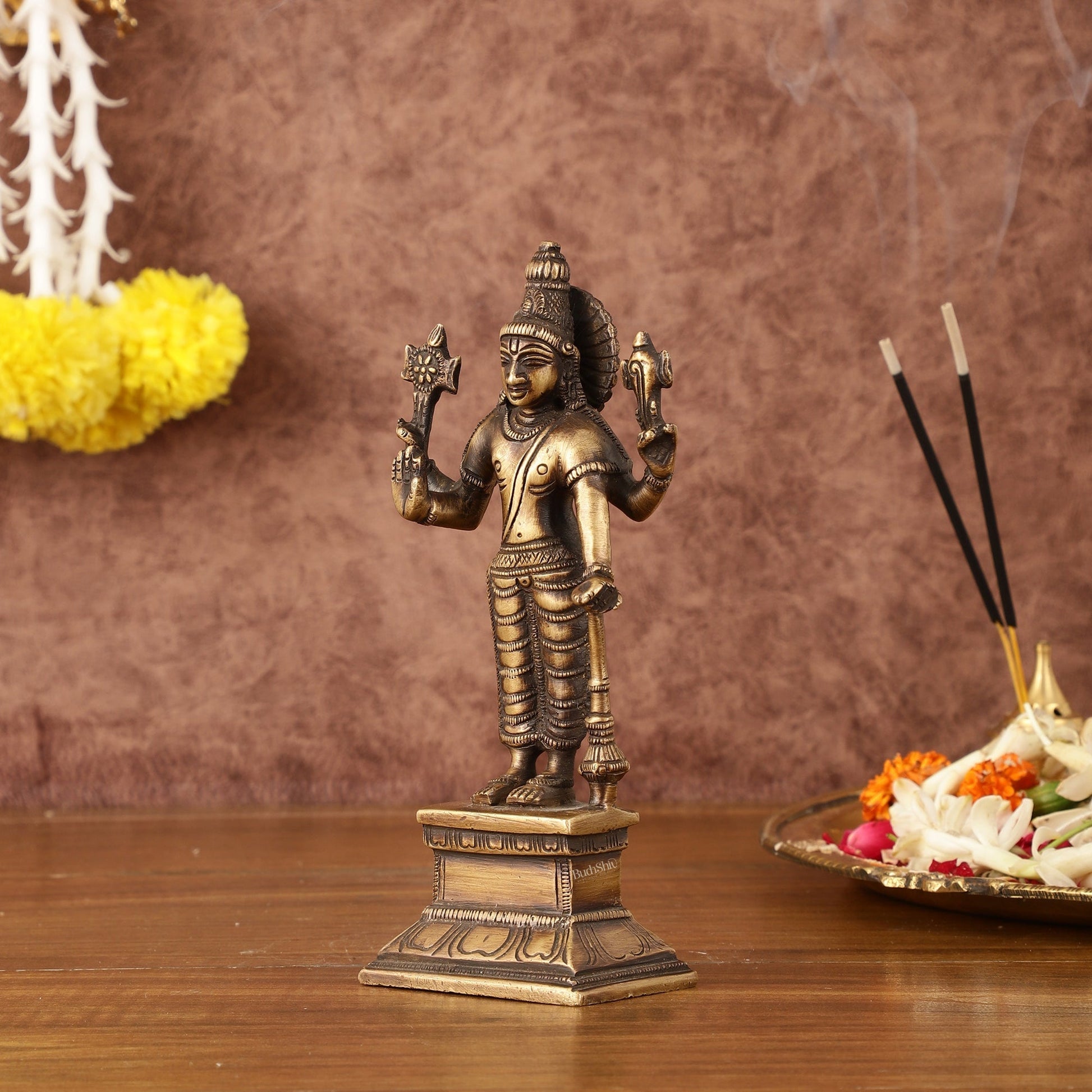 Enhance your spiritual space with our Antique Brass Standing Vishnu Idol. Standing 7" tall, 3.5" wide, and 2" deep, this intricately crafted idol weighs 600 gm. Perfect for adding a touch of divine presence and reverence to your home or altar.