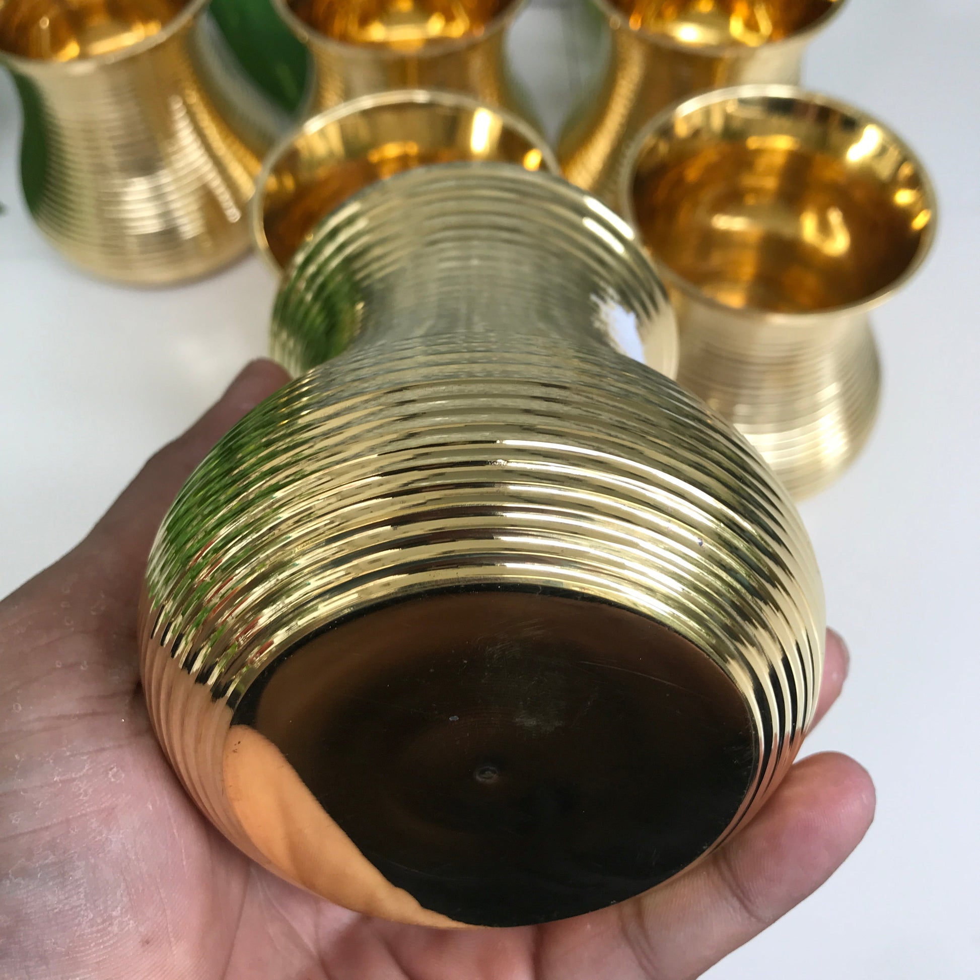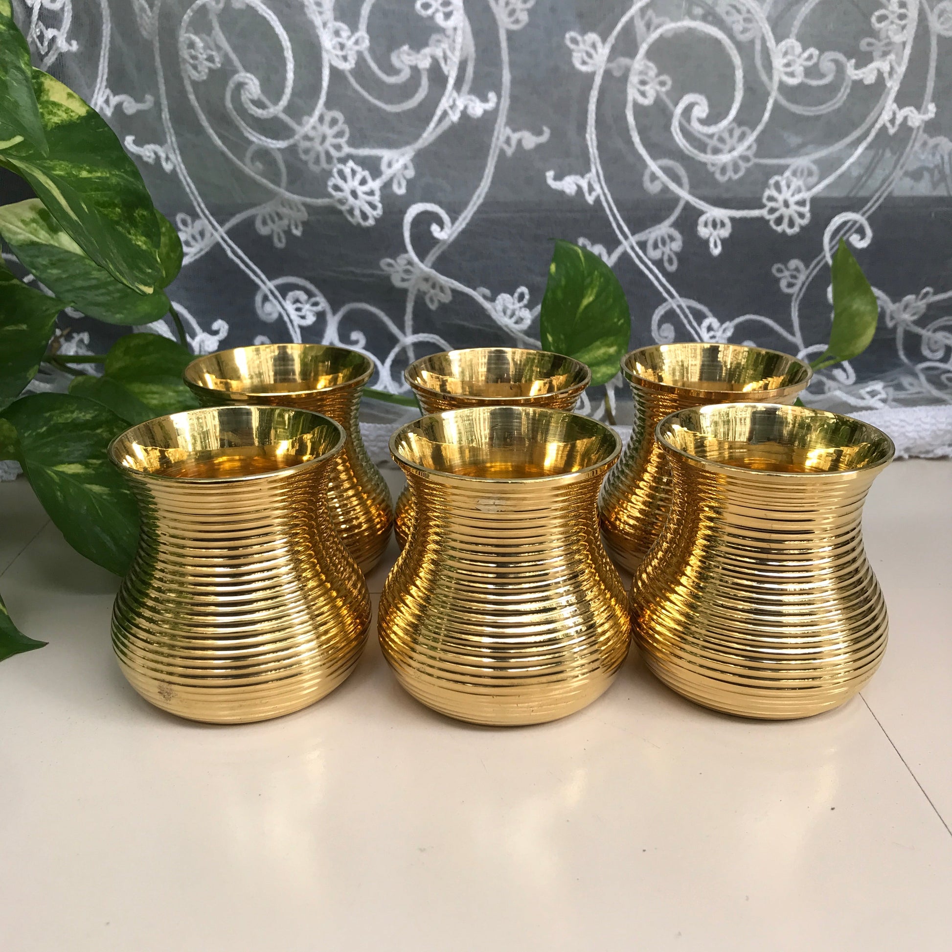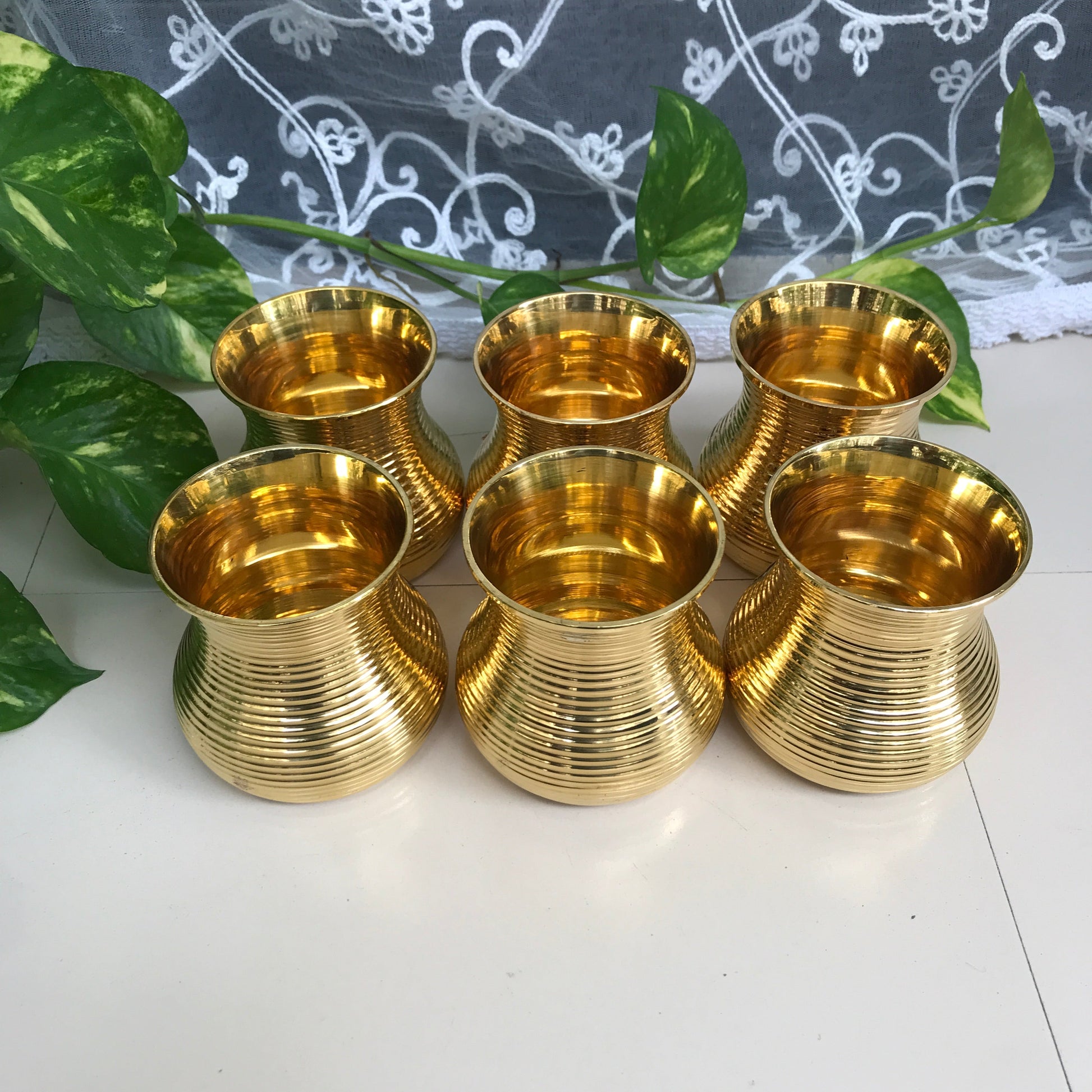 Brass Damru Tumbler Set of 6 | Large & Small Sizes | Elegant Brass Drinkware for Home Decor & Gifting