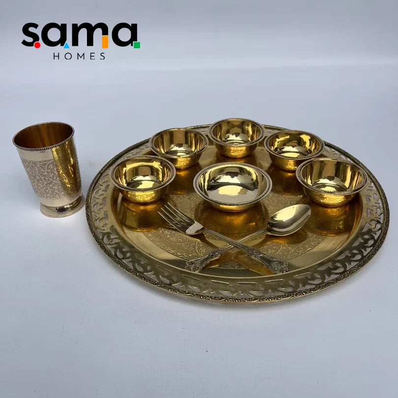 Transform your dining table with this handcrafted Brass Jali Dinner Set, also known as Pital Jaalidaar Dinnerware. Featuring intricate jali patterns, this traditional tableware is perfect for serving Indian meals during festivals, special occasions, or daily use. Made from durable and eco-friendly brass, this dinner set is reusable, toxin-free, and supports sustainable living. Its timeless design and premium craftsmanship make it an excellent gift for weddings, Diwali, and housewarmings. Order yours today for an authentic dining experience!