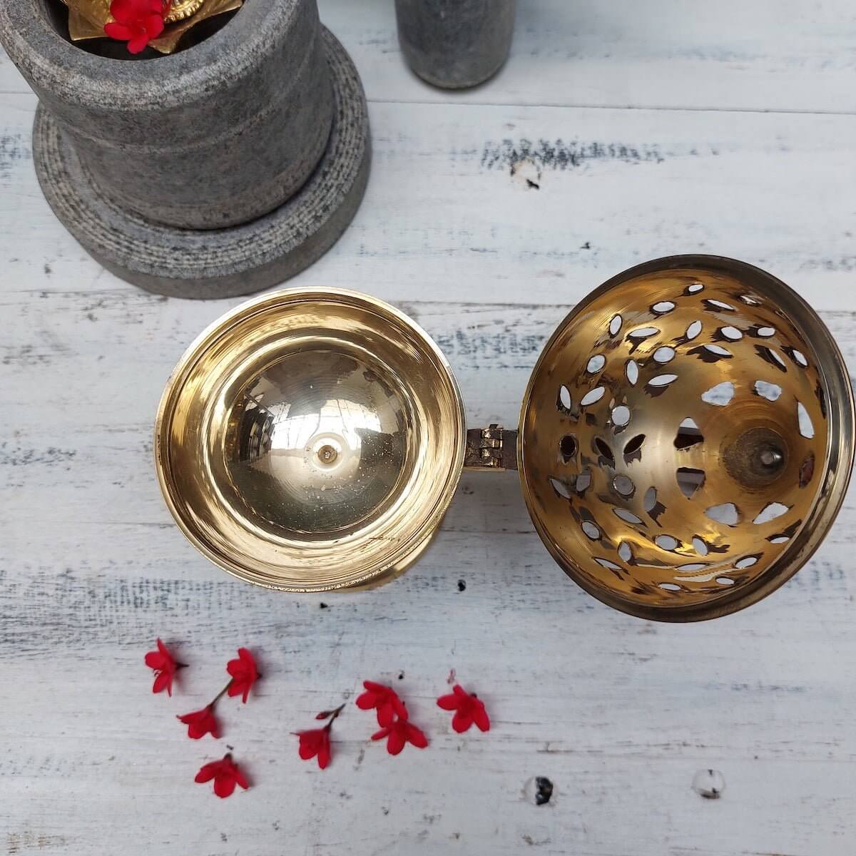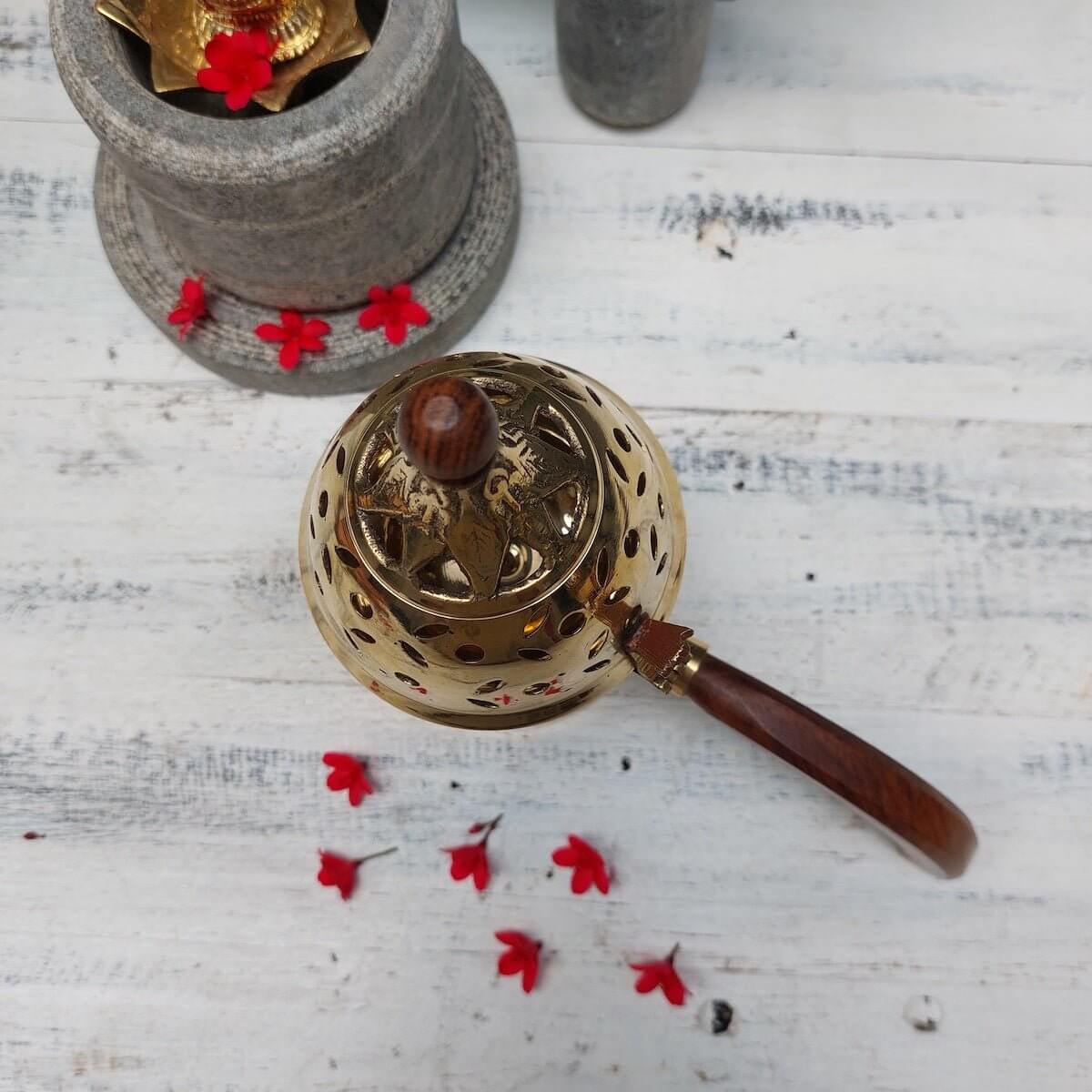 Zishta Brass Dhoop stand is meticulously hand carved by skilled artisans Of Uttar Pradesh. The Brass dhoop stand comes with a wooden handle, making it easy to hold as wood does not get hot.