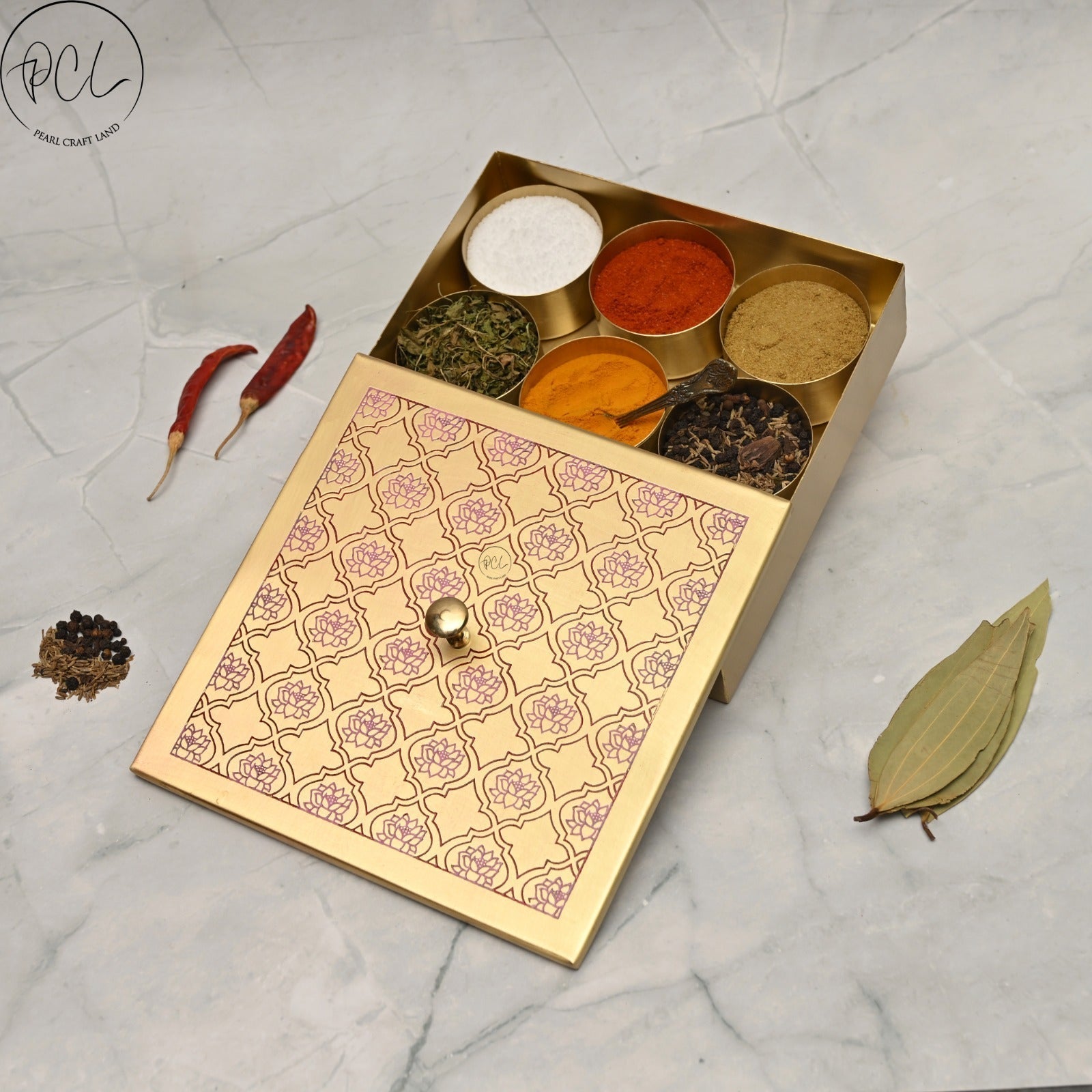 Handcrafted Brass Masala Box Lotus Design Set for Kitchen with Spoon (PINK)