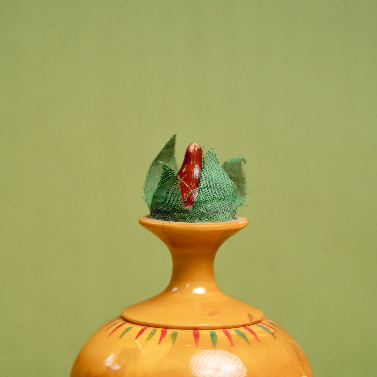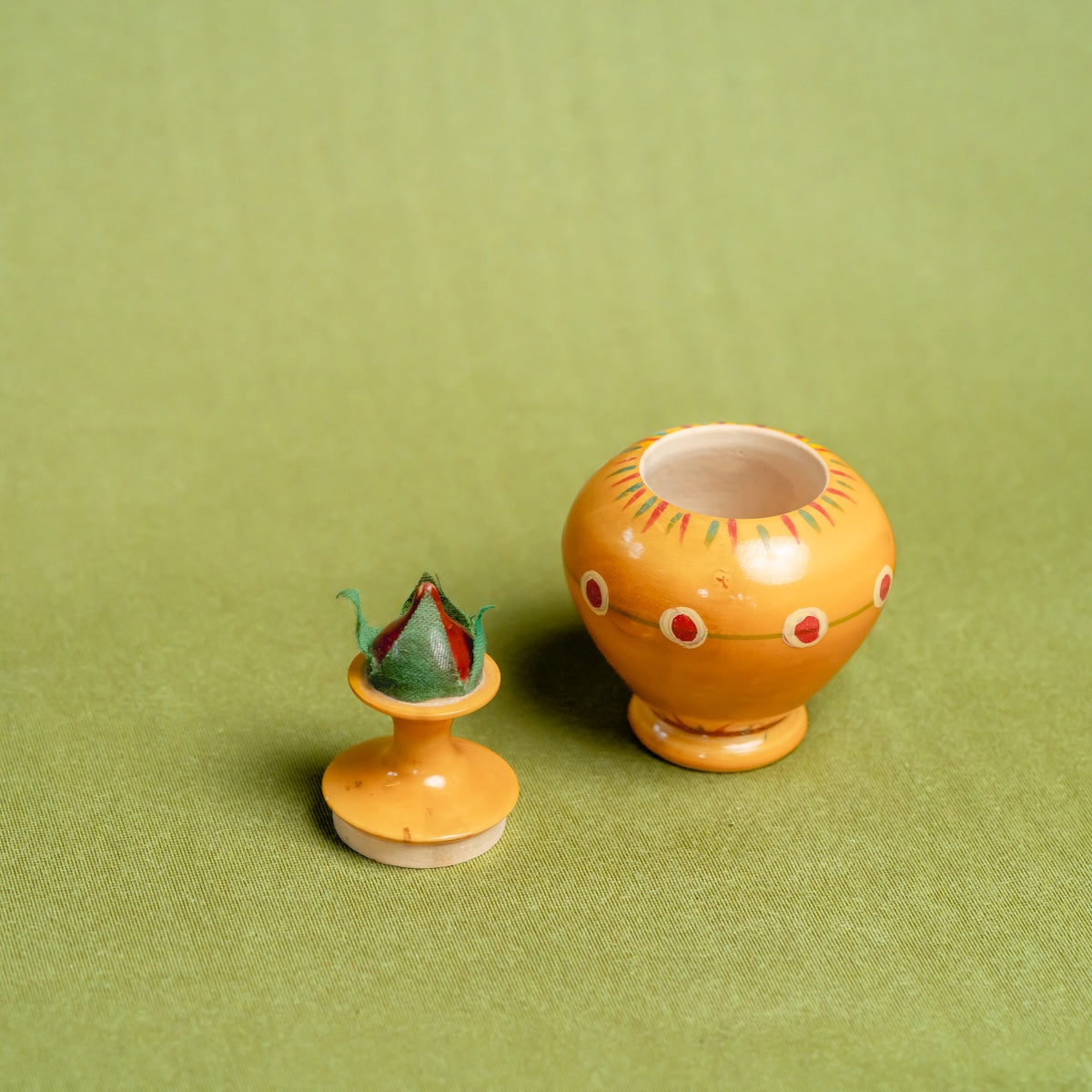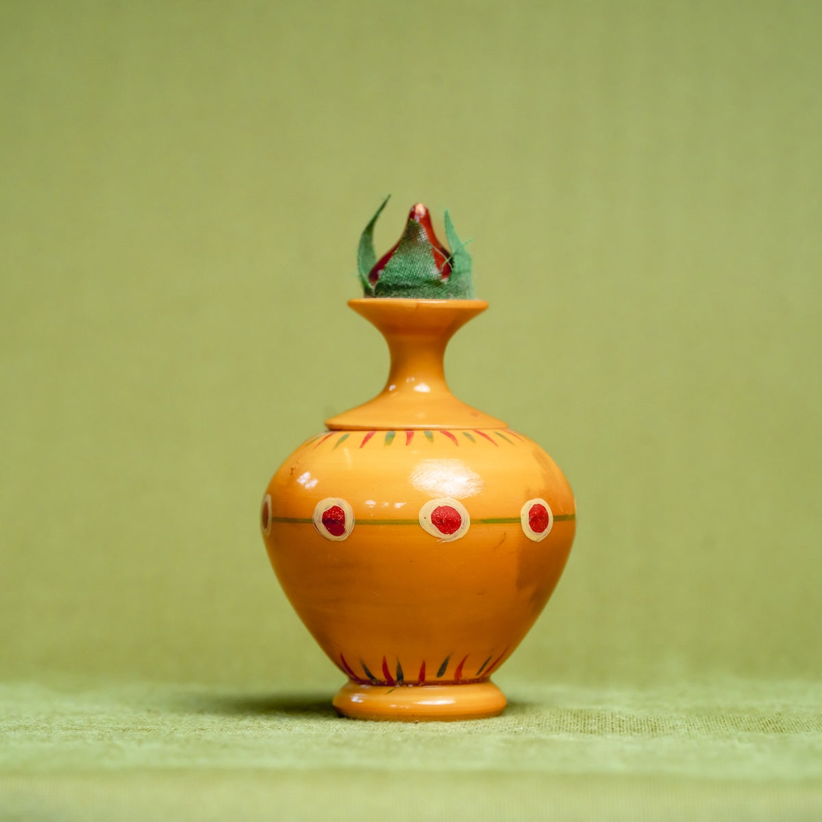The colour yellow represents auspiciousness. The lid of this wooden Kalash can be opened to keep kumkum or haldi in it.