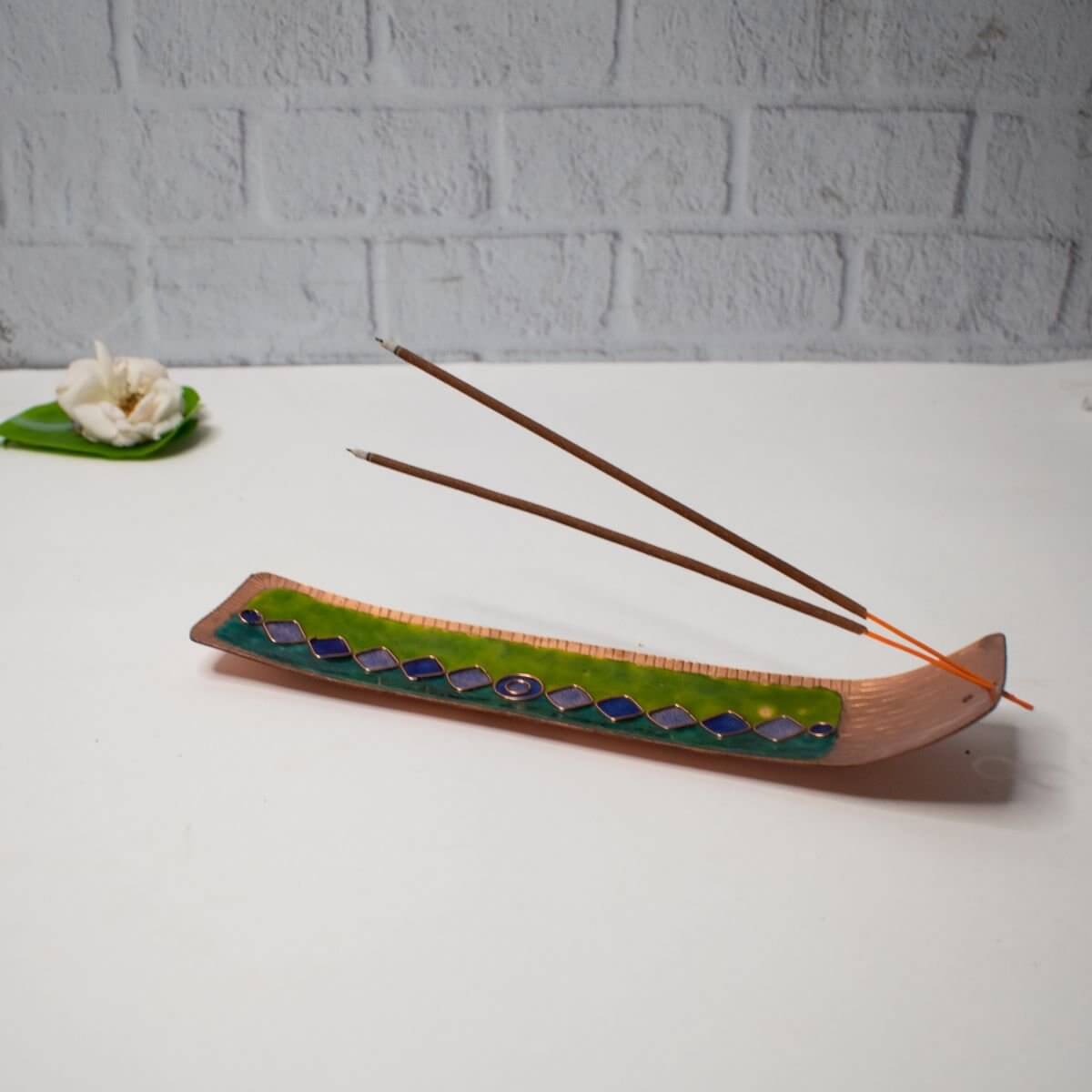 The handcrafted incense stick holder is made of copper, with enamelling in shades of blue & green.