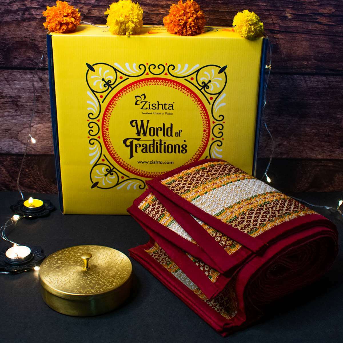 This lovely gift set comprises of maroon madur mat small and a brass pooja box.