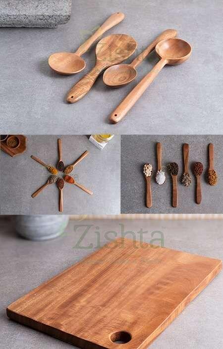 The set consists of Single Piece Neem wood Chopping Board, Dal ladle, Curry Ladle, Rice ladle, Gravy ladle, Set of 6 Spice Spoons and Set of 6 Masala Spoons
