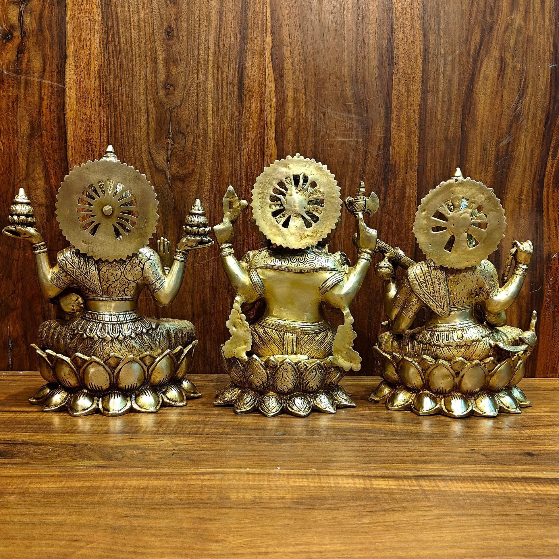 Handcrafted in pure brass with fine detailing. Bring home the Holy Lord Ganesha , Goddess Lakshmi and Saraswati Intricately crafted statues.