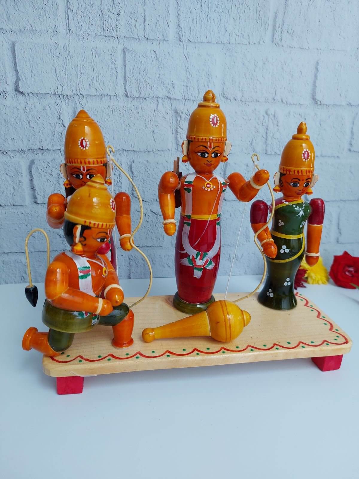 Ram Darbar set has Sri Rama in the centre holding his bow, his consort Sita to his left, Lakshmana to his right and Lord Hanuman kneeling in front of Sri Rama expressing his devotion.
