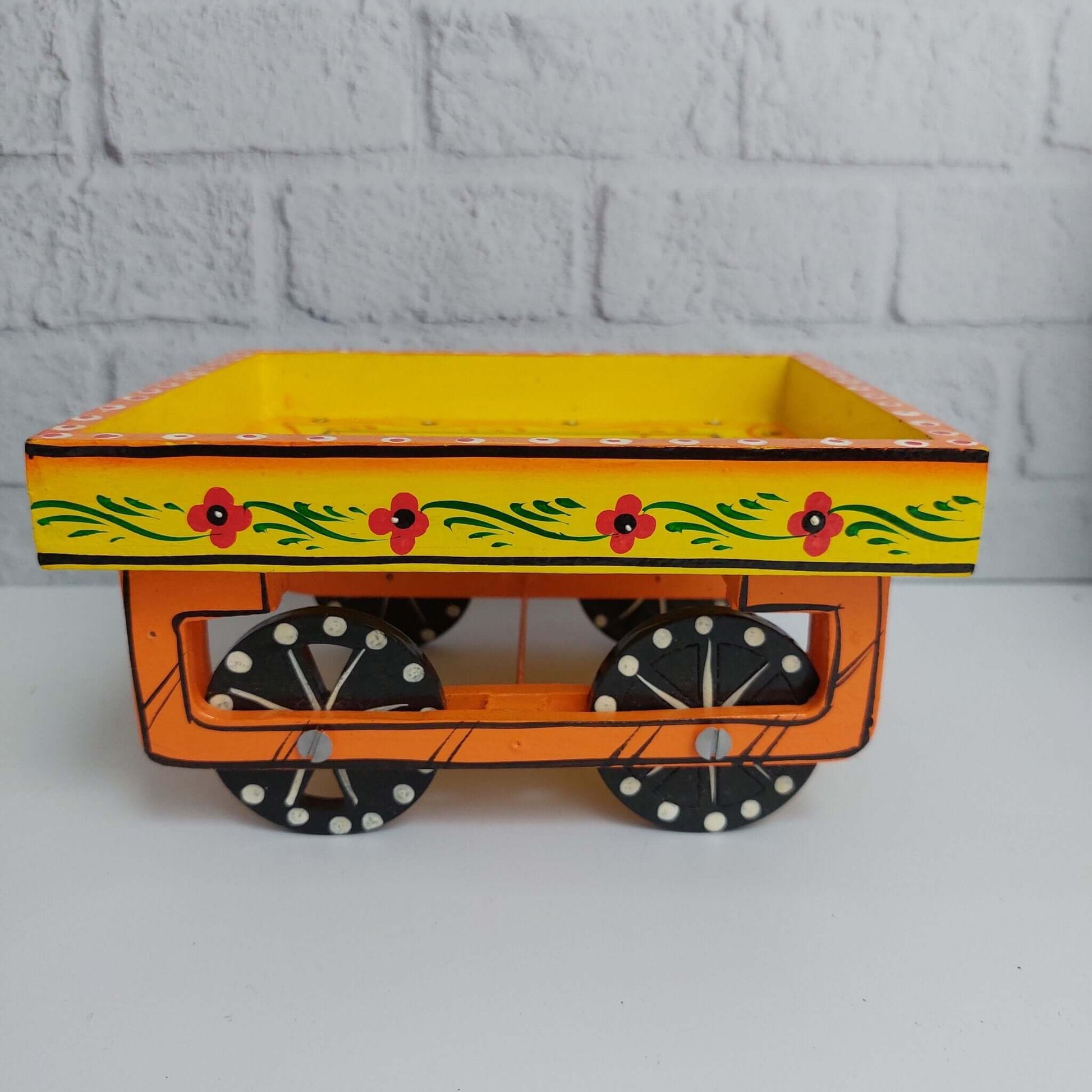 The thela is a lovely miniature of the original push cart used by vegetable vendors. Bright in colours and attractive, they can also double up to keep keys, stationary, chocolates etc. The thela can be pushed around and it is a pleasure to play with!