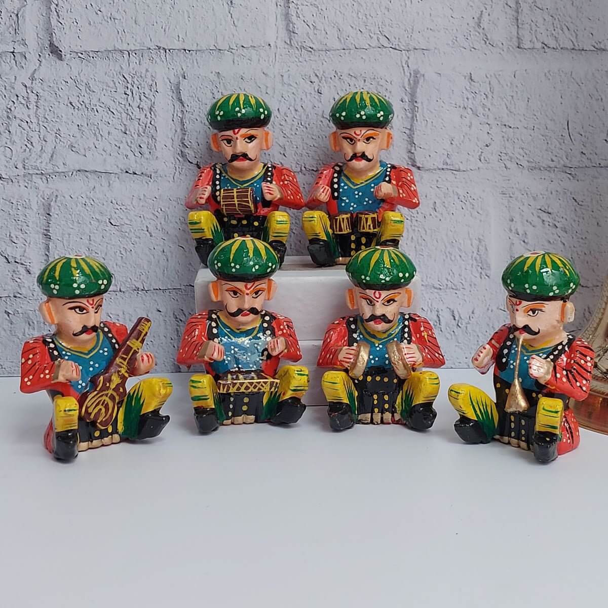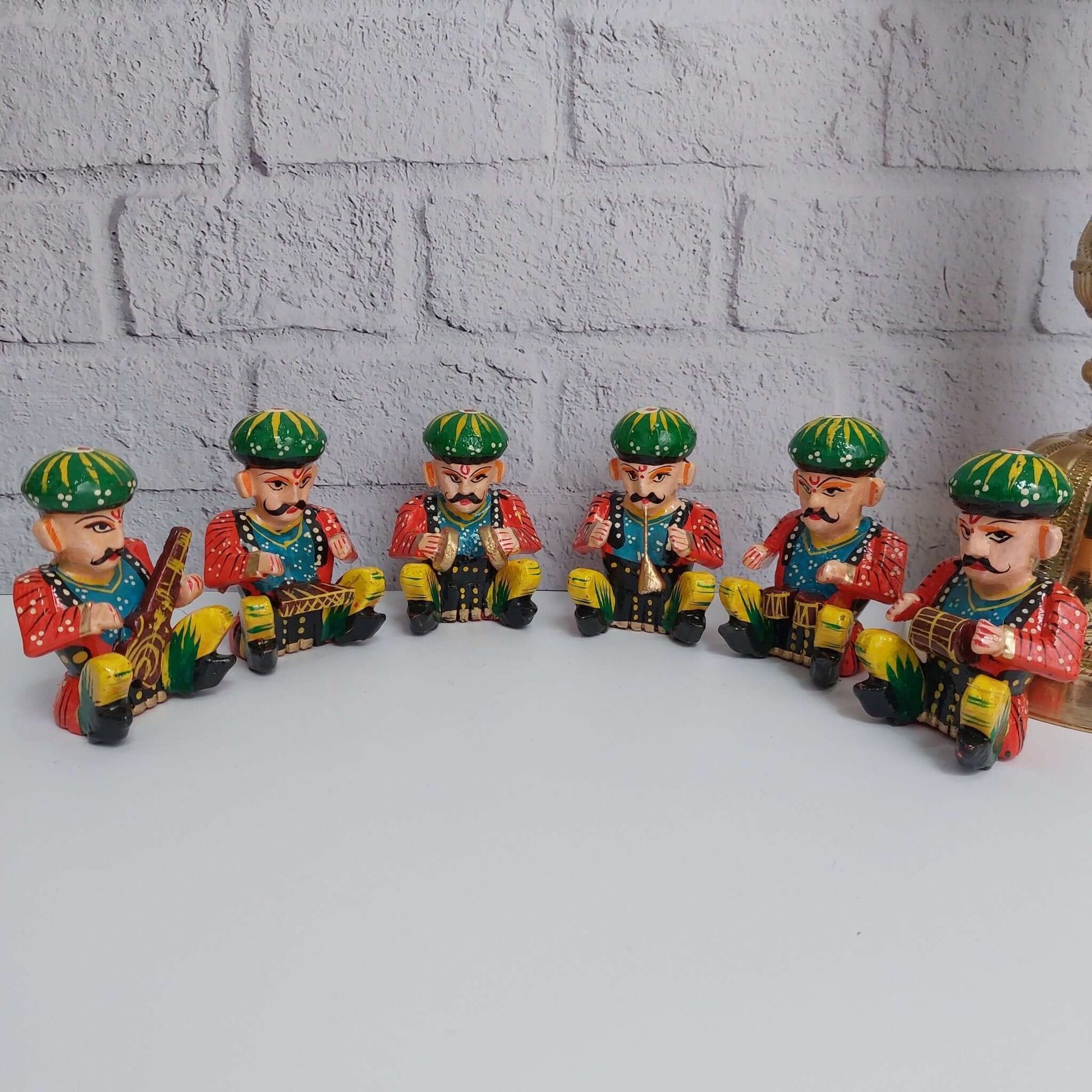 Set of 6 cultural musicians with each having a different instrument like sarangi, dhol, are made from a single piece of wood. Rich vibrant colours have been used to highlight their dress and the pagdi. They are light in weight and form a great addition to your home decor.