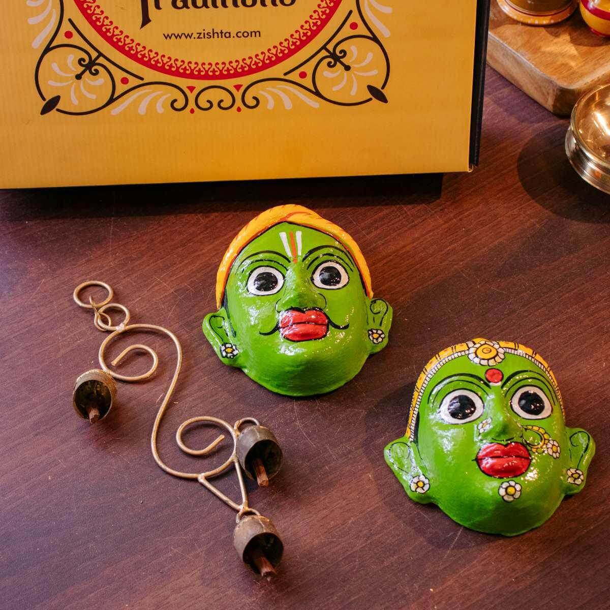 The set comprises of 1 pair of handmade nakashi wall mask in any color (yellow/ red / green - colors cannot be chosen as these are handmade)and 1 S Copper coated Iron wind chimes.